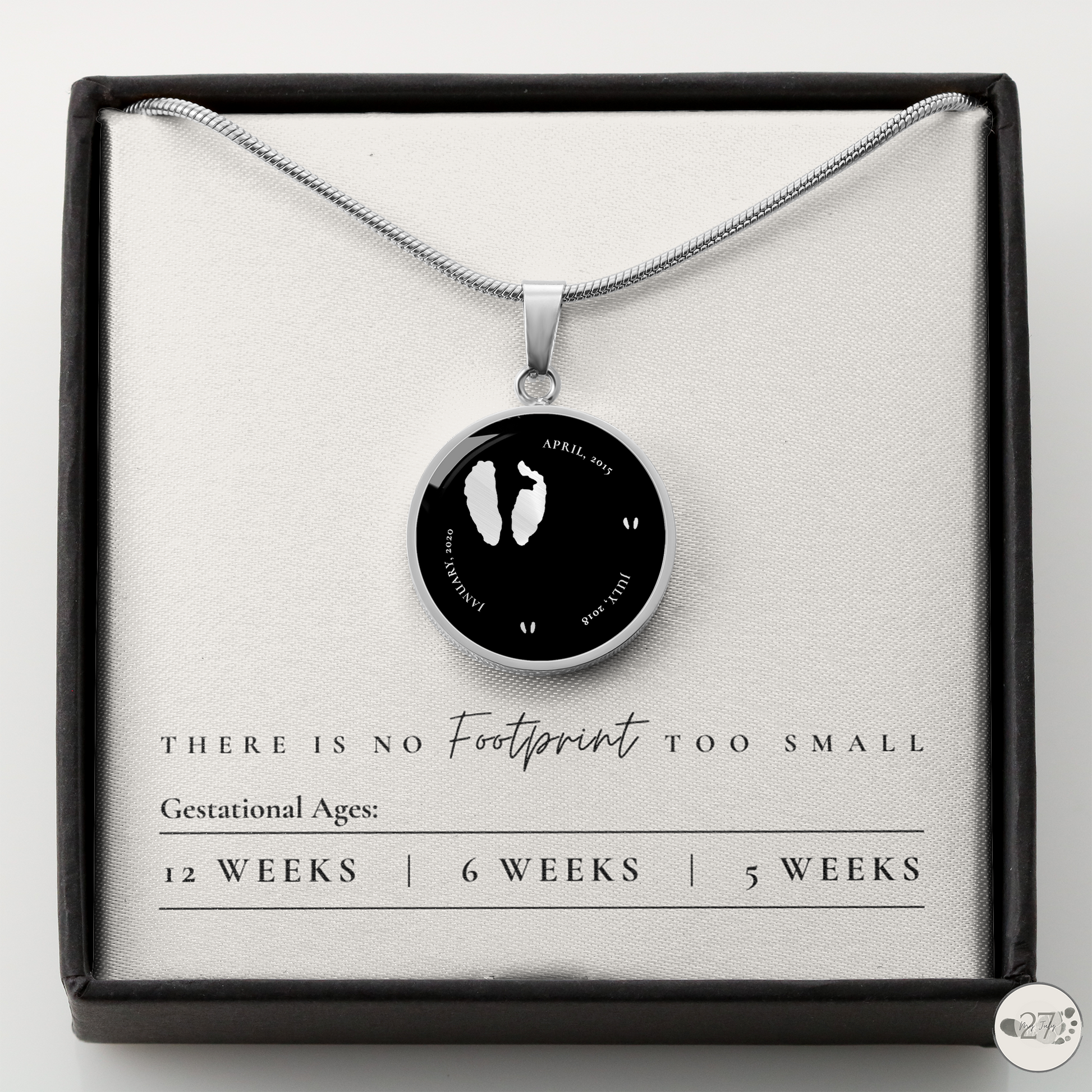 Over our years in business, MyJuly27 has received numerous requests to craft custom designs for parents with multiple losses. This specific listing accommodates three sets of first trimester footprints (up to a 13 week gestational age) with optional text on the front to name/date each footprint set and complete the circular layout.