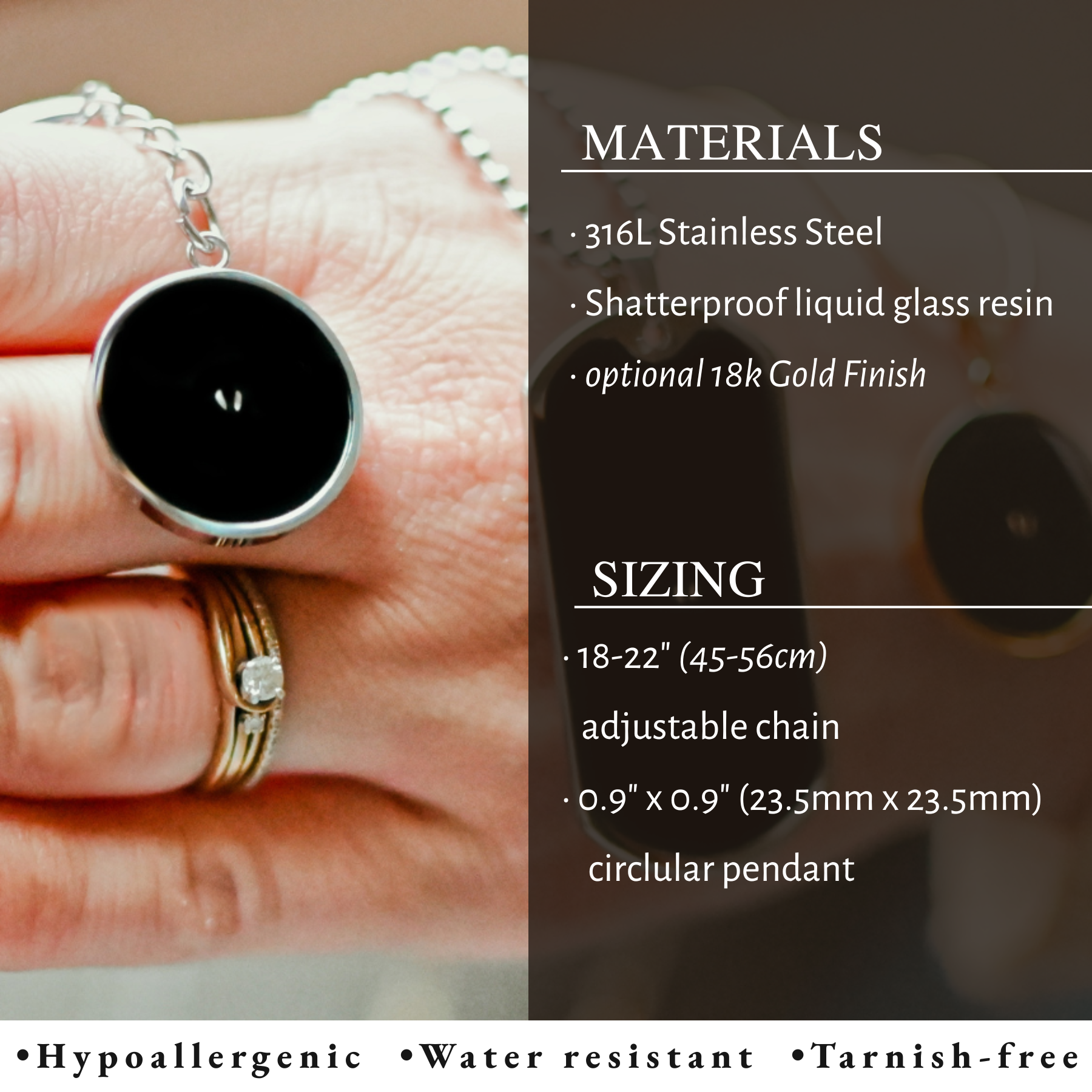 Our pendants are custom handmade to order, selectively composed of 316 surgical steel and precious metal.