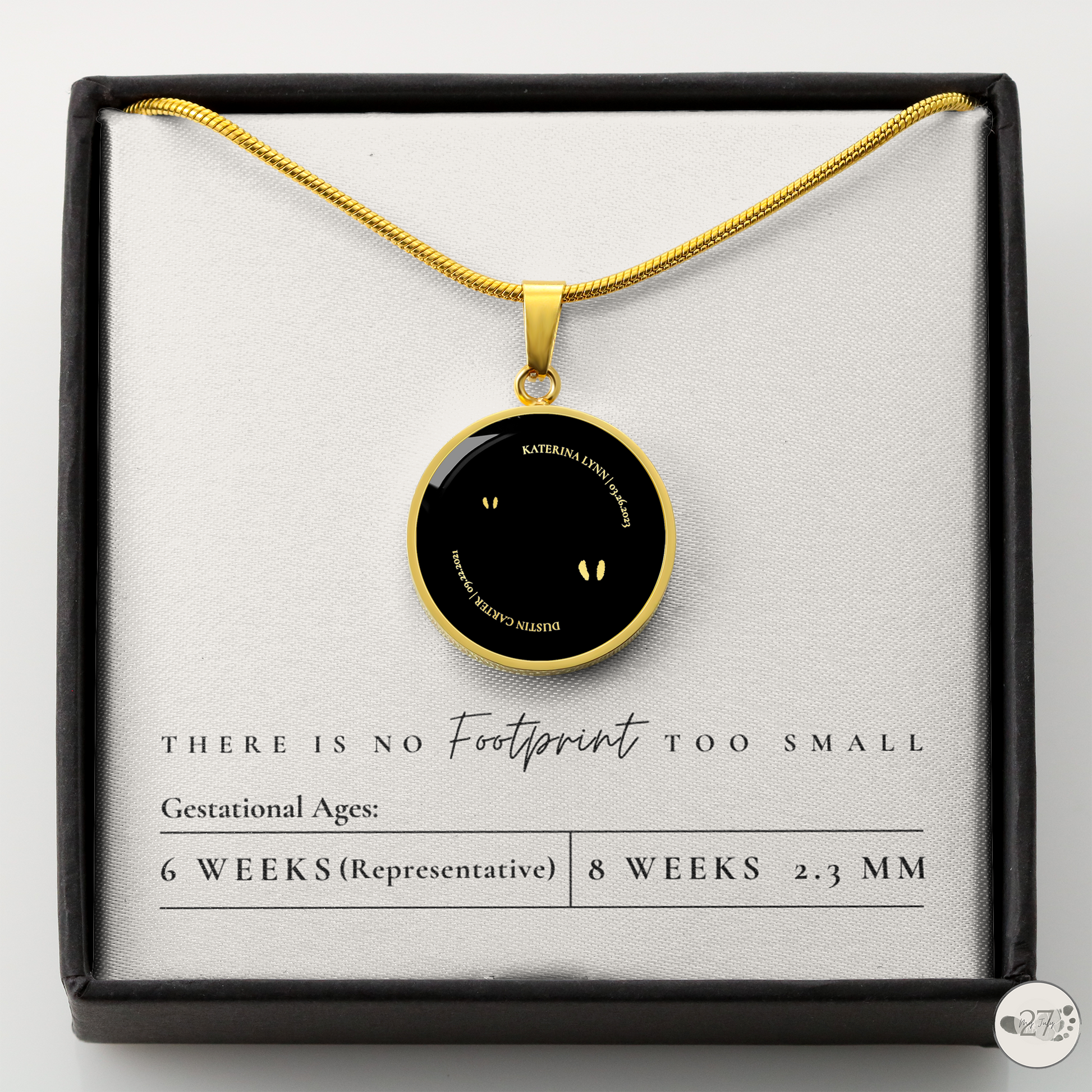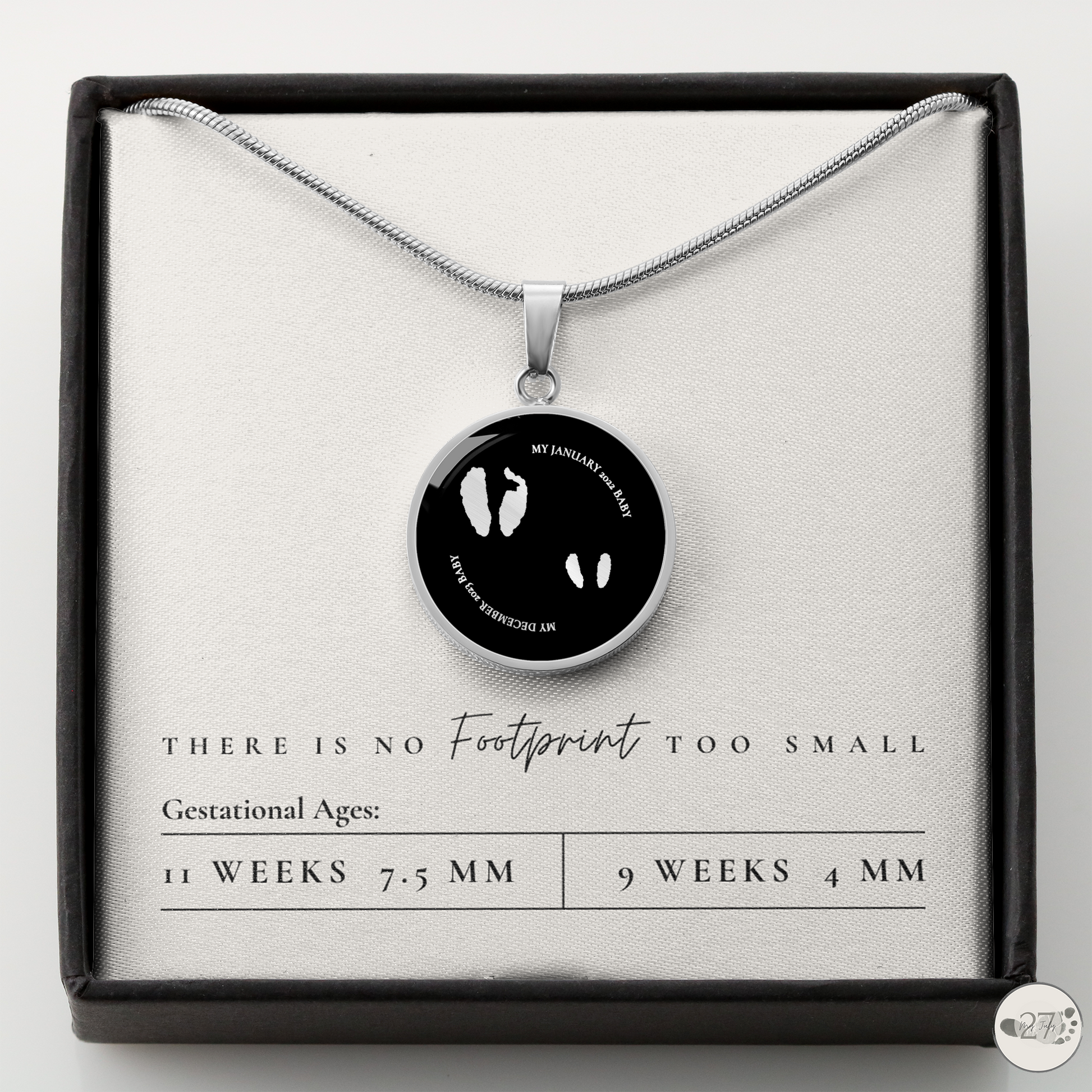 Over our years in business, MyJuly27 has received numerous requests to craft custom designs for parents with multiple losses. This specific listing accommodates two sets of first trimester footprints (up to a 13 week gestational age) with optional text on the front to name/date each footprint set and complete the circular layout.